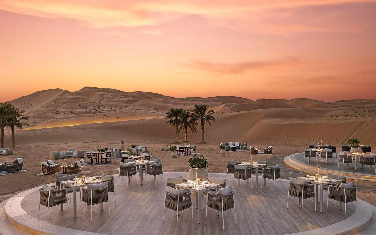 Na krovu, pod beskrajnim nebom, Suhail nudi elegantnu atmosferu i jela od mesa i morskih plodova, uz pažljivo birana vina i pogled na dine koje menjaju boju pri zalasku. Pored bazena, Ghadeer pruža opušten ambijent uz lagane zalogaje i osvežavajuće napitke tokom dana, dok se u večernjim satima pretvara u romantično mesto za večeru uz sveće.