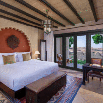 One Bedroom Anantara Villa (195 m²): Vila sa jednom spavaćom sobom, privatnim bazenom i prostranom terasom koja se otvara prema pustinjskom pejzažu. U enterijeru preovlađuju tonovi peska i jantara, uz autentične arapske motive i detalje od kamena i drveta. Kupatilo sadrži kadu i odvojeni tuš, a prostor za sedenje i trpezariju dopunjuju aparat za espresso, mini-bar i sef.