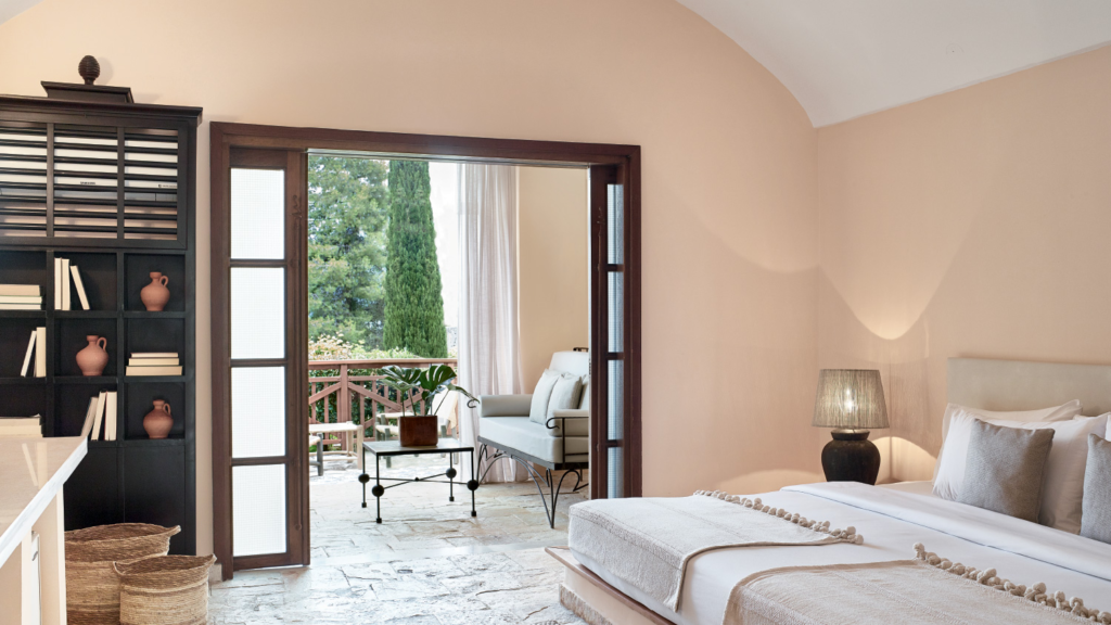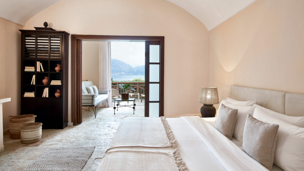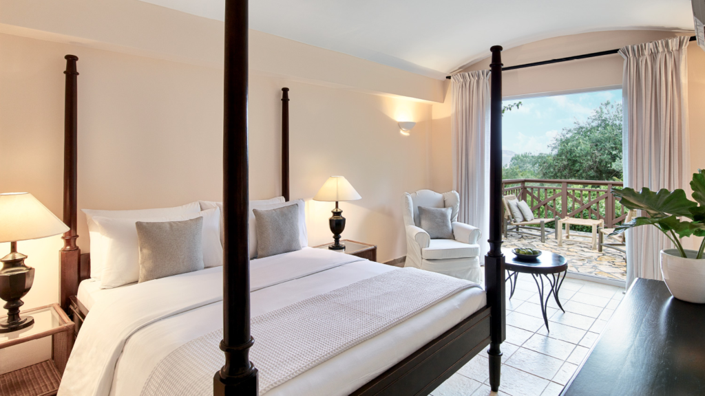 Superior Room Garden View / Sea View: Prostrane i elegantno uređene Superior sobe (28 m²) nude udoban boravak sa balkonom i pogledom na bujno zelenilo vrta ili otvoreno Jonsko more. Uređene u tipičnom jonskom stilu, ove sobe su idealne za parove ili male grupe do tri osobe koje žele kombinaciju komfora i prirodne svetlosti