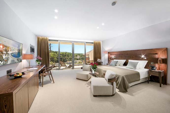 Deluxe Room Sea View: 37-42 m2 , sa balkonom (oko 12 m2 ) i pogledomna more i zaliv Čikat. Sobe su smeštene u glavnoj zgradi hotela.